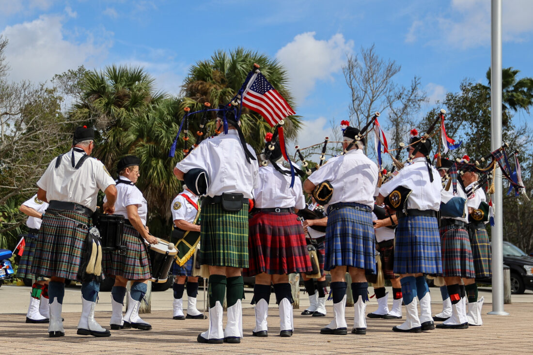 Providing the music for the Iwo Jima flag raising ceremony was the “Guns 'n Hoses Pipes 'n Drums of Southwest Florida”. MARK CLIFFORD