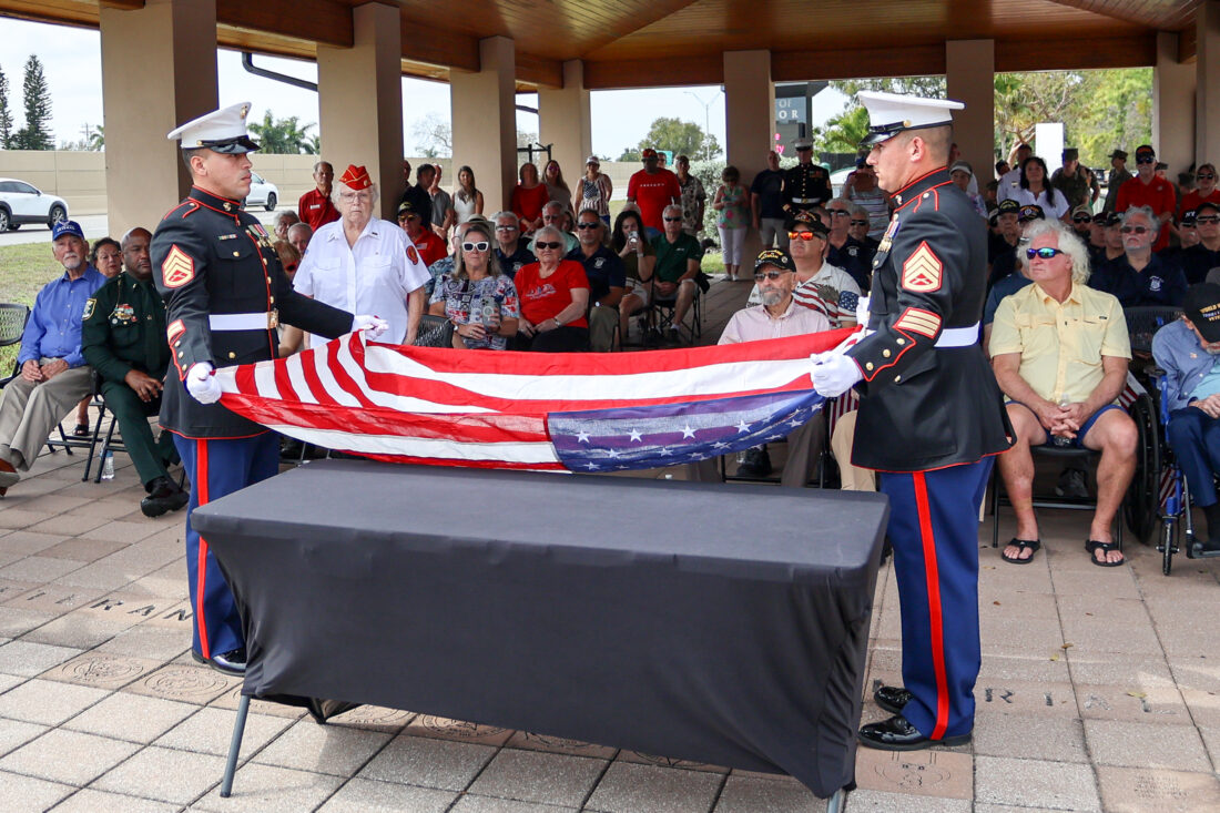 USMC SSGT E6 Wingfield presents the flag to John Camp, US Navy LCDR O4 and WWII veteran. MARK CLIFFORD
