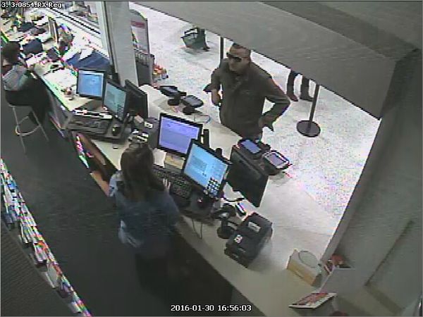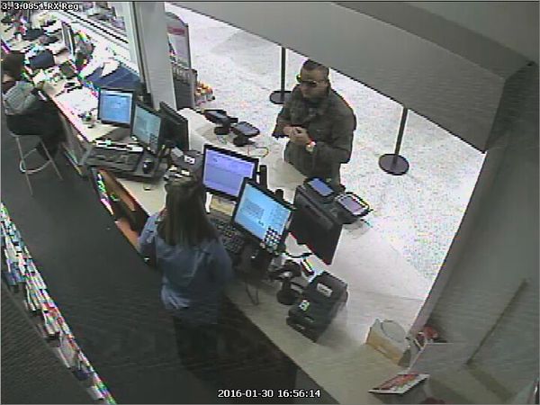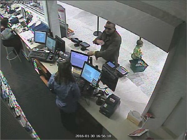 The man in the photographs is a suspect in a case involving fraudulent use of a credit card and identity theft.