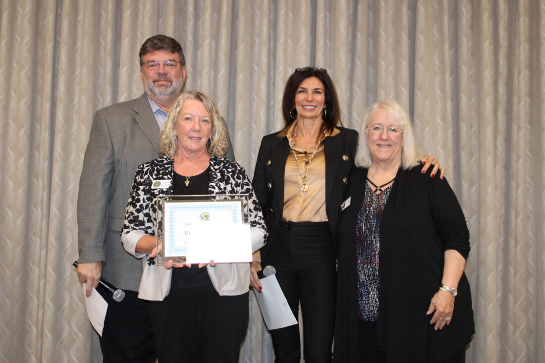 North Fort Myers Chamber of Commerce President John Gardner, Sandra Alamilla from LCEC, Trish Lassiter from LCEC and Toni Rae Hurley, the Chamber's executive director honoring LCEC as Community Partner of the Year during the Chamber's Awards Luncheon at Gulf Coast Village on Thursday.