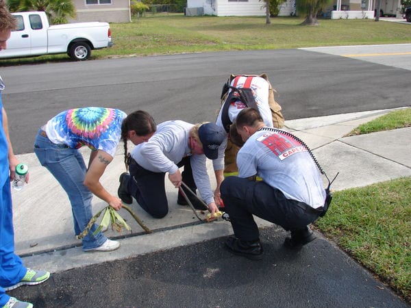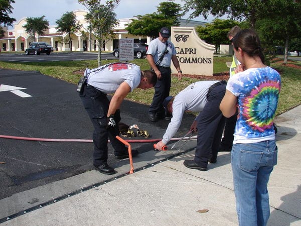 Cape Coral firefighters from Engine 5 and Rescue 5 under the command of Lt. James Hunt responded and discovered the ducklings had fallen through a very narrow grate at the entrance to Capri Commons. There was no way to open up the area and get down to the ducklings, which were approximately 2-3 feet below ground.