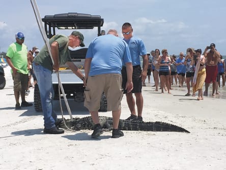 It took a couple of hours to fish this alligator out of the gulf on Fort Myers Beach on Thursday, but when it was done a 7.5-footer was finally secured and hauled off.