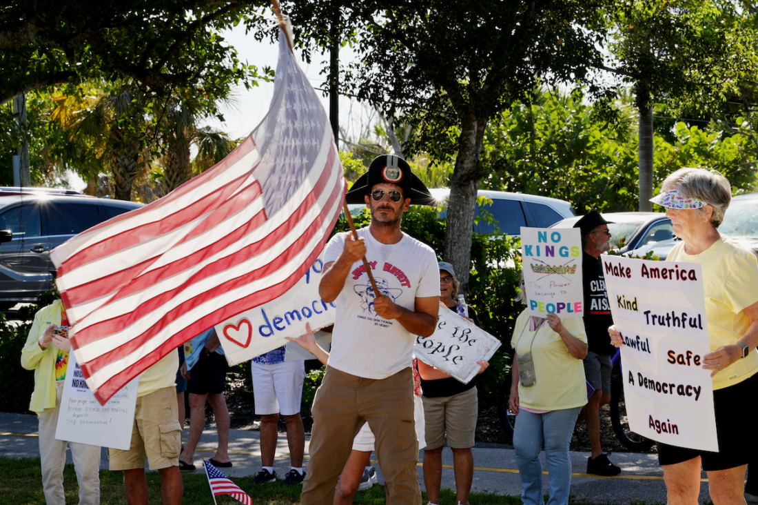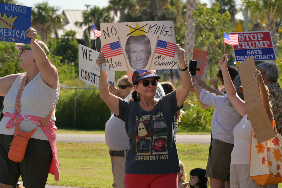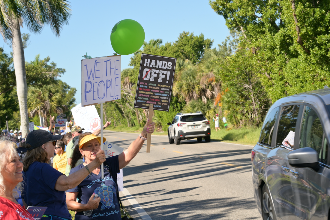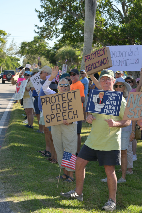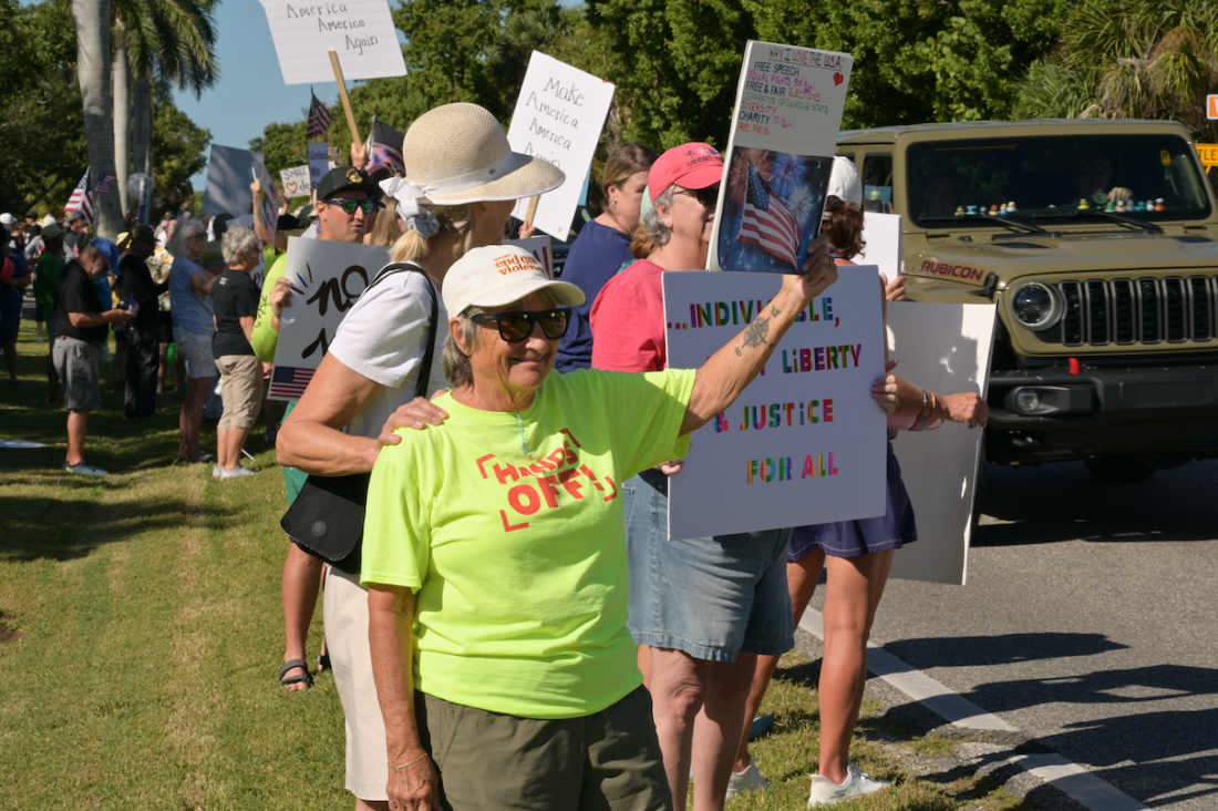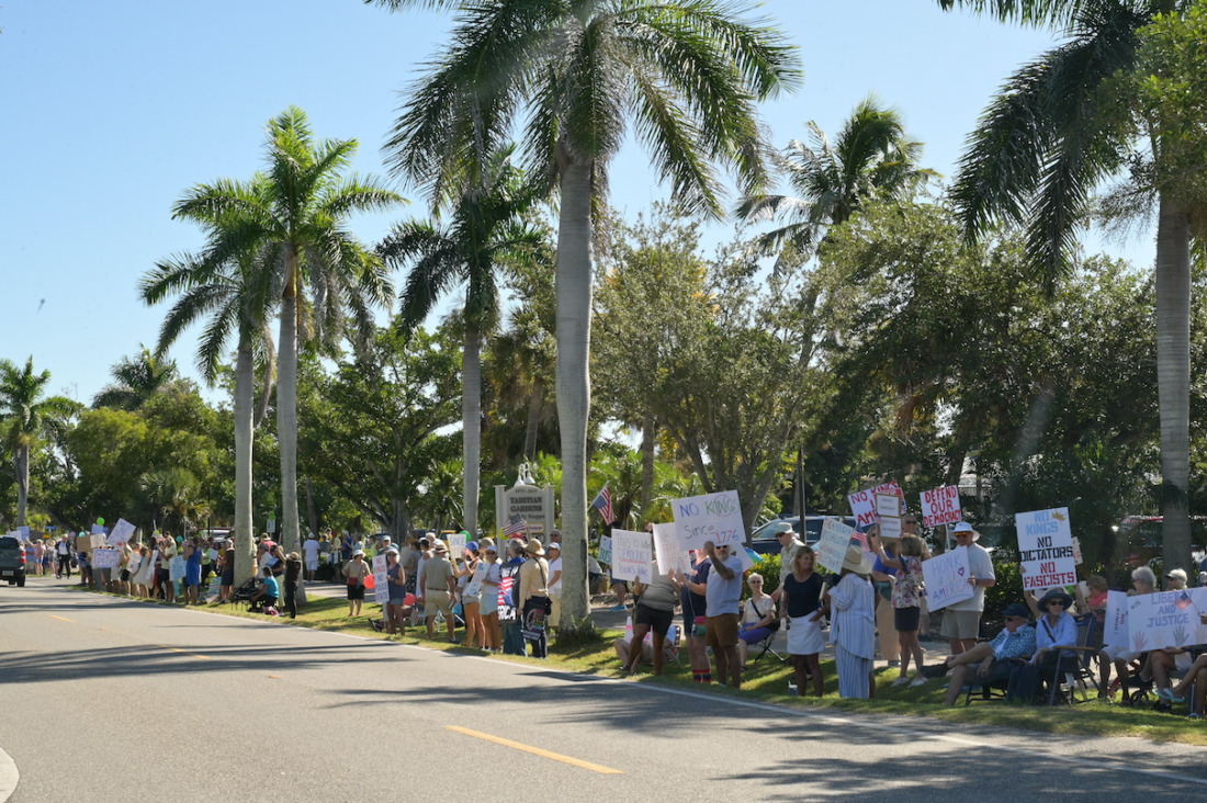 For the second time in four months, peaceful protestors assembled on Oct. 18 along Periwinkle Way on Sanibel as part of a national movement in opposition to the Trump administration and MAGA agenda.