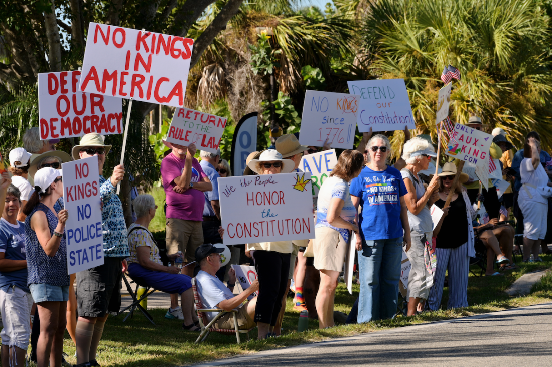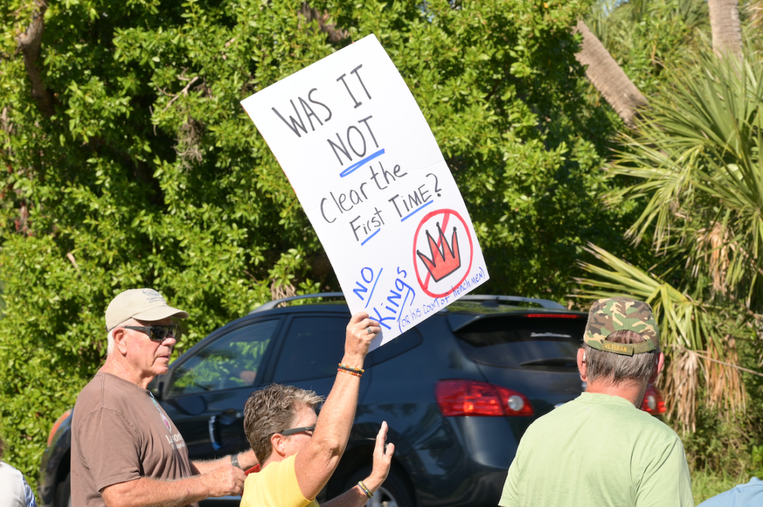 Ronald Green sat in a lawn chair among the feet of the demonstrators. A board member for the Progressive Club of the Islands, he helped to organize the protest and the first “No Kings” in June.