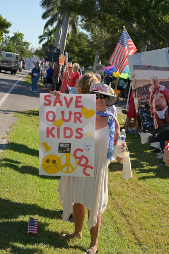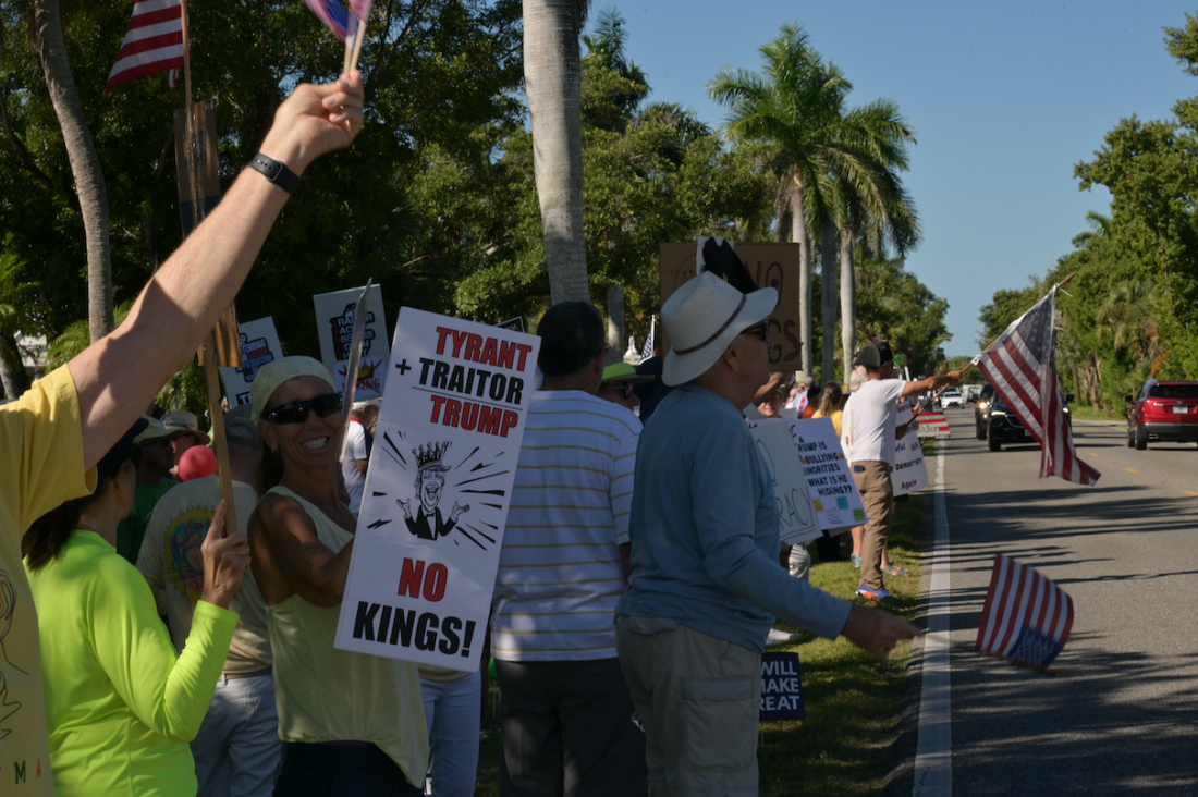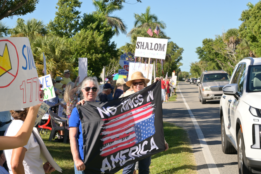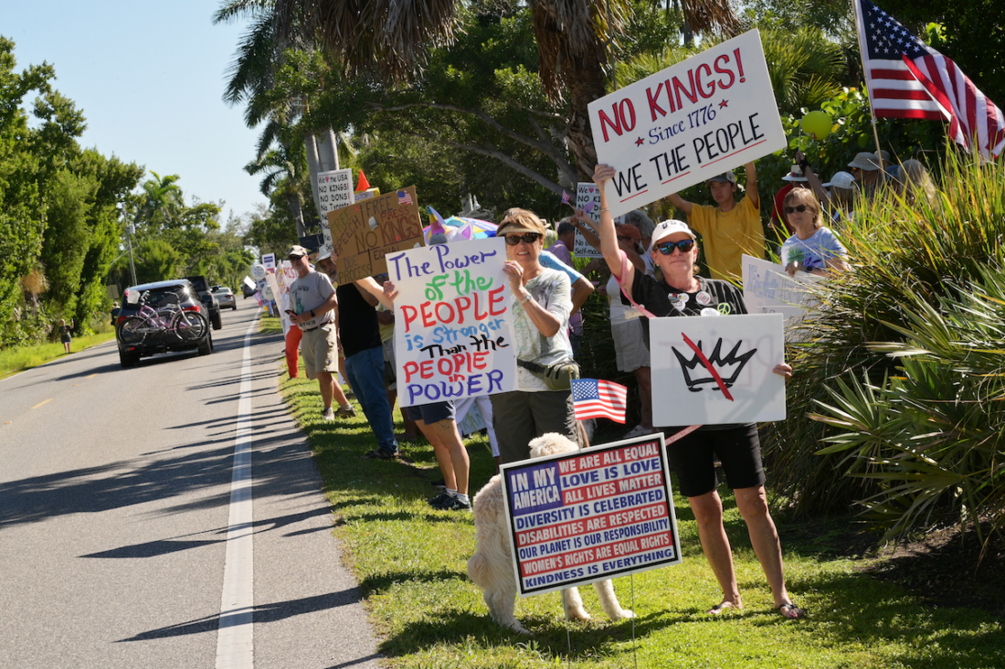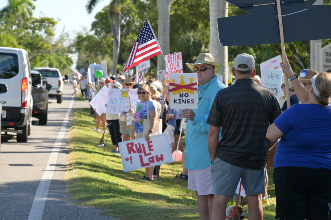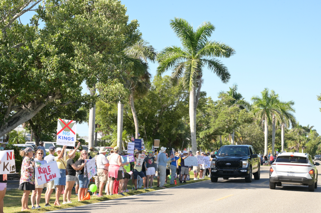 Protestors line Periwinkle Way on Sanibel on Oct. 18 for a “No Kings” protest organized by the Progressive Club of the Islands. It was the second held on the island, with the first in June.