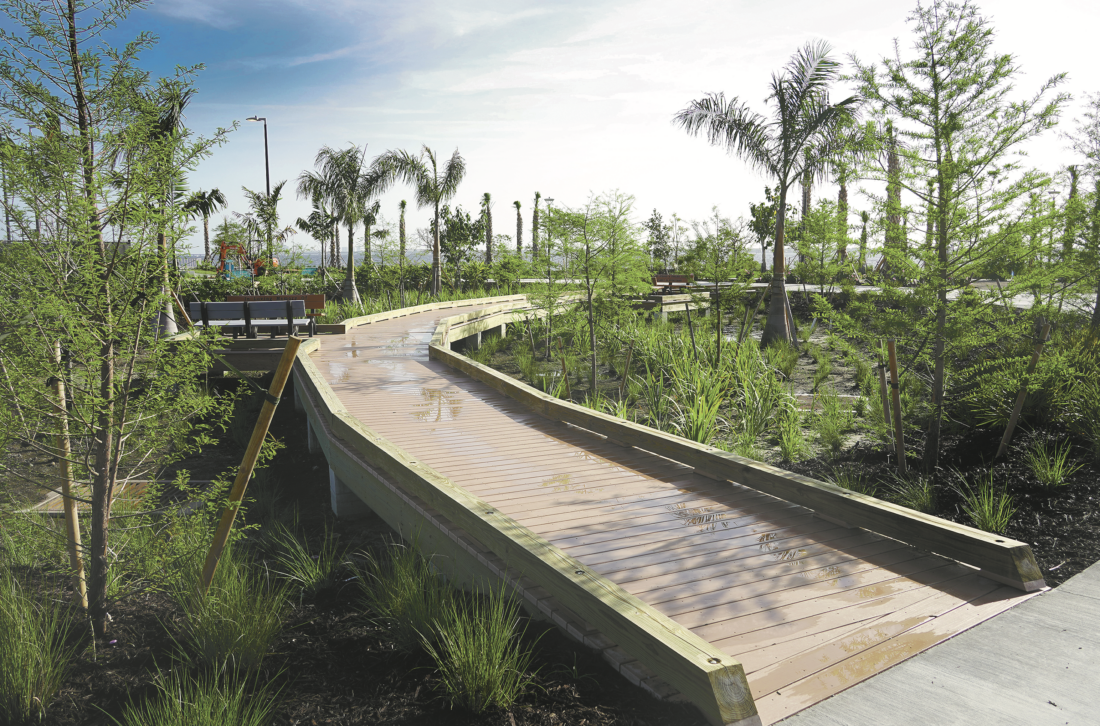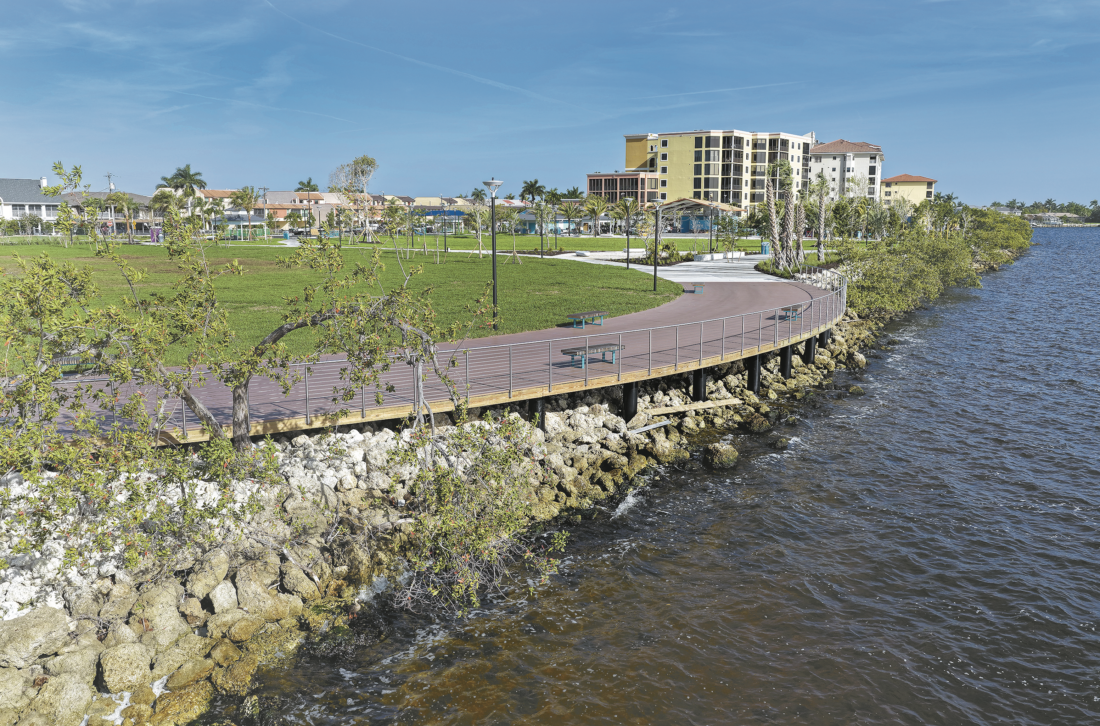 Park-goers can now enjoy the new lighted riverfront boardwalk and overlook, upgraded pathways with cooling misters, native landscaping, improved accessibility, large inclusive playground, adult changing stations, a 5,000- square-foot splash pad, shaded picnic areas, bandshell for performances, cornhole, pool and shuffleboard tables, and beach volleyball courts.