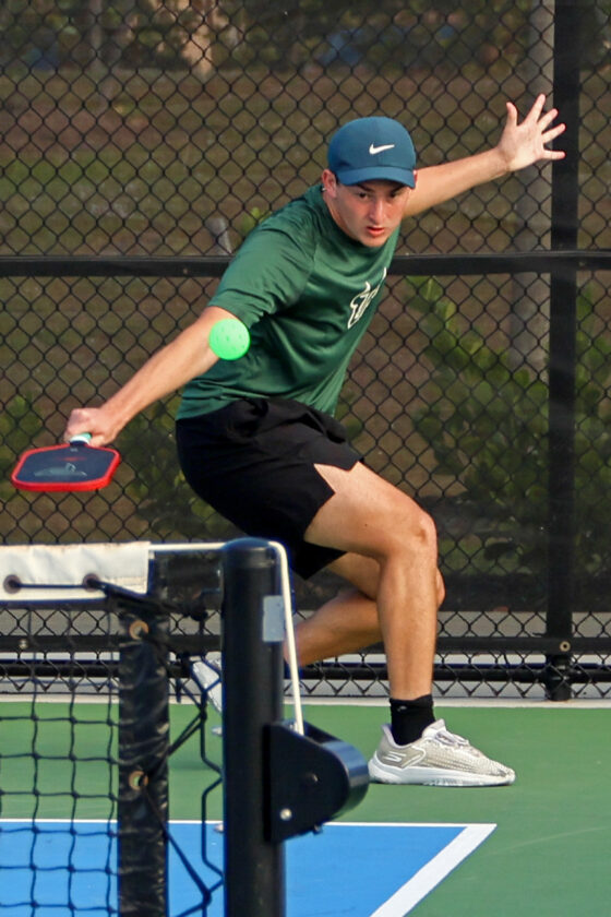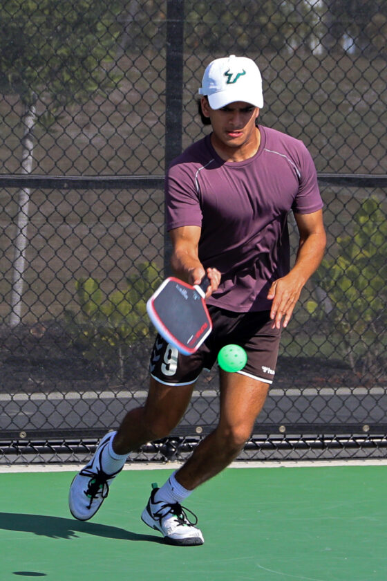 University of Southern Florida Green’s Adan Ahmed returns the serve in men’s doubles competition. MARK CLIFFORD