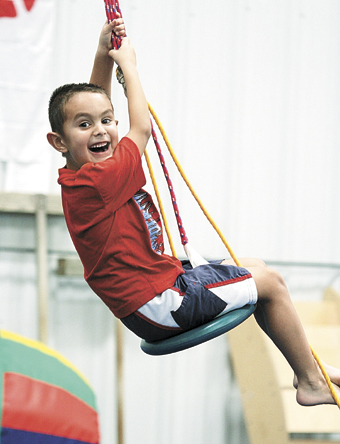 Isaac Segovin, 6, weems to enjoy sliding down a zip line Friday at Tropical Twisters Gymnastics. Below, Katie Weaver, 6, practices a back hand spring on the main exercise floor. The gym now serves about 100 kids and is working to construct a larger facility to extend programs to more than 500 kids