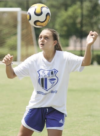 Morgan Holbrook works on technique for heading the ball at the Cape Coral Soccer Association Elite Soccer Camp for competitive and recreation all-star players ages 7-16 Wednesday