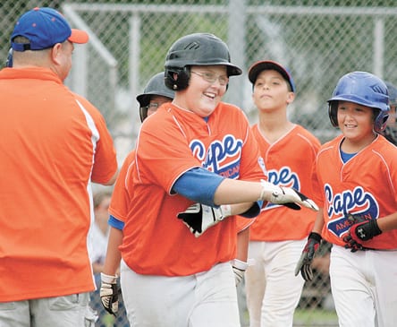 Hancock’s Ryan Davis (2) gets greeted by teammates after hitting a home run Thursday. More Little League photos are available online at cu.cape-coral-daily-breeze.com