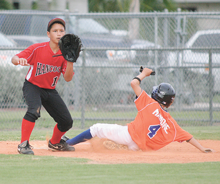 Cape Coral American South Little League All-Star Austin Maimone slides into third base as Hancock’s Jose Valmanan waits for the ball. More photos of the game are available at cu.cape-coral-daily-breeze.com.