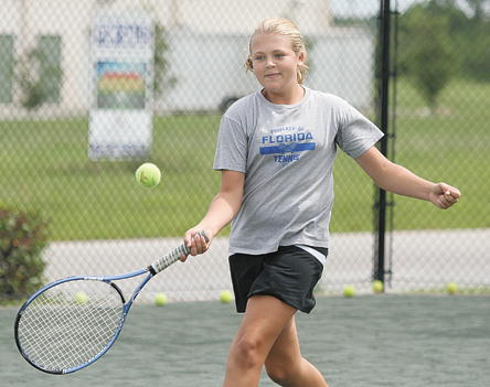 Melia Coughlin practices her return of serve Friday during the Mid-Cape Racquet & Health Club’s junior tennis camp. More camp photos are available online at: cu.cape-coral-daily-breeze.com.