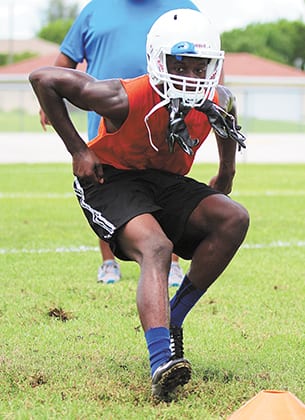 Cape Coral sophomore Dwayne Emilus works on his footwork during a drill in this first week of fall practice. More photos are available online at: cu.cape-coral-daily-breeze.com under Latest Galleries in the Scholastic Sports folder. The Seahawks are preparing for their preseason classic at Fort Myers on Aug. 21.