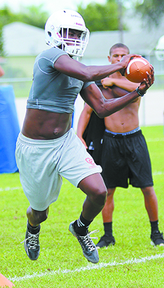 Senior C.J. Lewis catches a ball while drilling for the defensive unit. More photos are available online at: cu.cape-coral-daily-breeze.com under Latest Galleries in the Scholastic Sports folder.