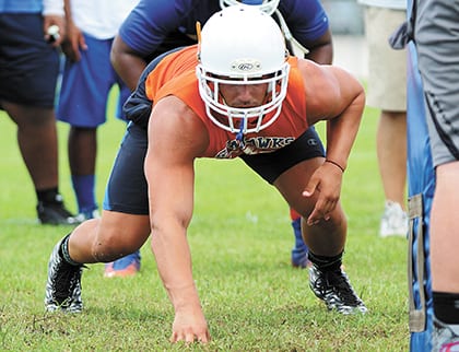 Cape Coral senior Dominick Onzo takes a lineman’s stance during the first week of fall practice. The Seahawks open the regular season at home against Sarasota on Aug. 28. More photos are available online at: cu.cape-coral-daily-breeze.com under Latest Galleries in the Scholastic Sports folder.