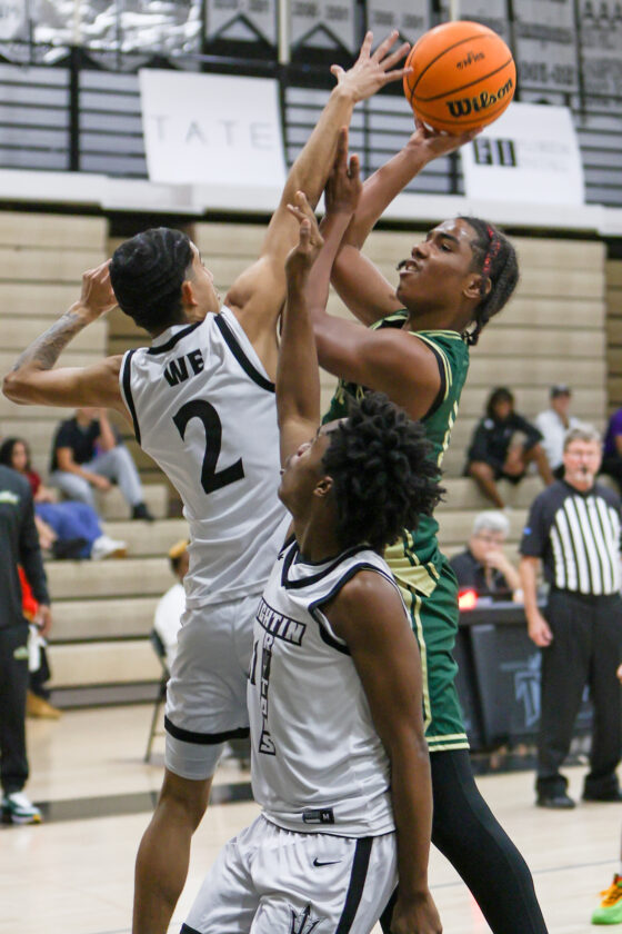 Island Coast’s Terran McClendon attempts a close jump shot against the tight defense of Mariner’s Govani Ortiz (2) and Jerry Brown (11). MARK CLIFFORD